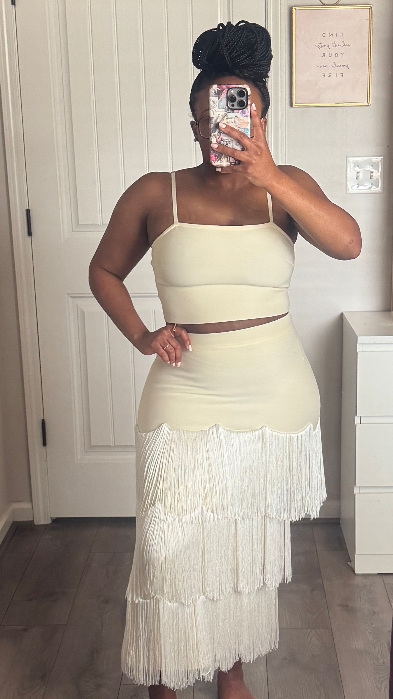 Make a statement in this stunning cream two-piece fringe set featuring a sleek bandeau crop top with thin adjustable straps and a matching high-waist tiered fringe maxi skirt. The skirt's three-tier cascading fringe hem creates a mesmerizing movement with every step – equal parts glamorous and effortlessly chic. The buttery, form-fitting fabric sculpts the body beautifully.